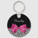 A trendy black and white leopard print keychain with a vivacious dark pink ribbon tied into a cute girly bow. Personalise this chic and stylish animal pattern design by adding the name of your teen girl. Flat printed image, not actual ribbon.