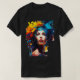 This image depicts a vibrant and expressive portrait of a woman. The artwork features bold, dynamic brushstrokes and a vivid colour palette, primarily consisting of blues, oranges, and yellows. The woman's hair appears to be in motion, with splashes of paint extending outward, creating a sense of energy and movement. Her facial expression is serene yet intense, with striking blue eyes that draw the viewer's attention. The background is minimal, allowing the focus to remain on the subject and the vivid colours that surround her.