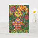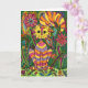 This multicolored striped cat with colourful, highly detailed markings is sitting in the shade of a dense, vivid garden teeming with exotic, ornately patterned plants and flowers in this unique and uplifting design.