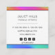 A trendy square business card featuring a vivid holographic rainbow design. Your contact details, including phone, email, website and social media handle are on the reverse side. You can customise further to remove icons for social media that you do not use, and reposition icons if necessary.
