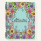 This is a beautifully designed, customisable sketchbook that exudes a sense of elegance and creativity. The cover is adorned with a vibrant and intricate floral design that frames the central personalised text. The blossoms, in hues of purple, pink, yellow, and green, are meticulously detailed, offering an aesthetic appeal that is both refreshing and elegant. The backdrop’s soft teal colour accentuates the colourful flowers, creating a harmonious contrast that is pleasing to the eye. The central text is inscribed in a stylish combination of cursive and capital letters, indicating personalisation options for any name or title. The sketchbook features a practical spiral binding on the left side, ensuring ease of use.