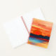 Journal in a semi-abstract sunset behind a shoreline with trees, in psychedelic colours of Fiery orange and red, accented with ocean blue