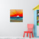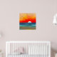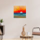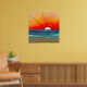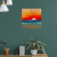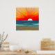 Poster in a semi-abstract sunset over the ocean, in psychedelic colours of fiery red and orange, with a deep blue ocean