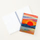 Journal in a semi-abstract ocean sunset behind a mountain range, in psychedelic colours of fiery red and orange, with dark indigo blue mountains
