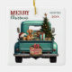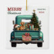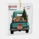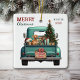 A teal blue retro pickup truck carries a decorated Holiday tree and gift packages on this cute glass Christmas ornament. Looking out from the tailgate is a beautiful red Vizsla dog. A rustic wooden sign on the back bumper says "Christmas Cheer". The red and green stylised text at the top left says "MERRY CHRISTMAS", with your name (or your dog's) and the year at the right. Both sides have the same image.