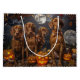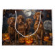 Unleash the spooky spirit with this eerie Halloween design featuring a pack of dogs under a dark, moonlit sky, surrounded by flying bats and glowing pumpkins. Perfect for those who love a touch of frightful fun with their furry friends!