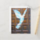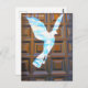 postcard with the bird of René Magritte in the style of surrealism, consisting of skies and clouds on a wooden door in Seville.