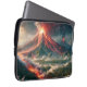 A majestic volcanic eruption dominates the scene, with vibrant red lava flowing down the slopes and a plume of smoke billowing into the sky. The surrounding landscape is lush with greenery, contrasting the fiery eruption.