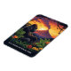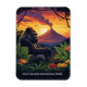 A vibrant sunset over a volcano in Volcanoes National Park, with a gorilla in the foreground and lush tropical foliage.