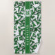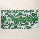 This volleyballs pattern beach towel features a random pattern of varied size green and white stylised volleyballs turned every which way on a customisable white background - personalise with her name and jersey number - by katz_d_zynes