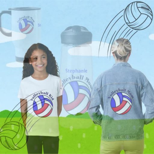 Volleyball Mum text curved around a red, white and blue volleyball. Mum's name is in matching royal blue in the middle. Good gift for Mother's Day.