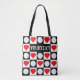 A super cute and customisable women's tote bag for volleyball players, coaches and fans, featuring a unique black and white chequered design with bright red hearts on the white squares and volleyballs on the black squares, and a custom text box where you can type in your own volleyball team name or any other text (school name, mascot, slogan, etc.)! These are perfect for volleyball players, volleyball moms, coaches and other fans to carry during volleyball season, especially to volleyball games and tournaments!