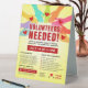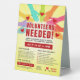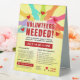 Volunteers needed advertisement table tent sign features colourful hands with red hearts, yellow background and bold typography. Customise sign to your liking.