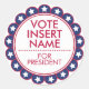 Whether you're campaigning to lead the country, your town, your school, your work, or independantly supporting your favourite candidate, these stickers will get your message noticed. Easily customise these premium round stickers with your own name and title or message. The smaller stickers can be used as seals for your mail campaigns. This design features red, white, and blue colours with white stars. (Tip: For a two word candidate title such as "Vice President", you can change the word "For" to "Vice".)