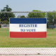 Vote is in blue text in the centre of this outdoor banner. A blue stripe is at the top. A red stripe is at the bottom. A white stripe is in the middle. You can change the words if desired.