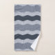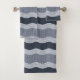 This bath towel set features a wabi sabi style abstract wavy river in shades of navy blue and slate blue for a contemporary look.