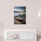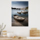 Poster of four wooden rowboats floating near the shore of a calm body of water under a slightly overcast sky. Large rocks and a few small structures are visible in the background.