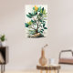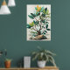 Wabi-Sabi art depiction of a stylised plant with vibrant green and yellow leaves growing from a rock, surrounded by softer, muted foliage. The background is light and unobtrusive, emphasising the detailed leaves and twisted branches.
