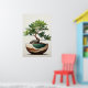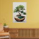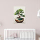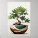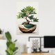 Wabi-Sabi art of a potted bonsai tree with vibrant green leaves and a twisted trunk is depicted with a high level of detail. The pot features a swirling, multi-coloured design that complements the organic shape of the tree.