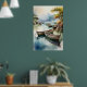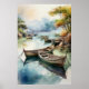 Poster of rowboats gently floating in a serene, turquoise body of water surrounded by rocky shores and lush foliage. The soft, diffused light creates an atmosphere of tranquillity and natural beauty.