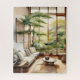 Jigsaw puzzle. A Wabi-Sabi style living room. Sunlight filters through large windows revealing a peaceful sitting area adorned with wooden furniture and lush greenery. The view outside showcases a harmonious blend of trees and nature, enhancing the serene ambiance.