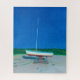 A painting of a single sailboat in a boat yard on a late spring day with a deep blue sky in the background. The artwork is about waiting for summer to start in New England and the fun on the water that comes with living in a coastal town.