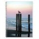 A single gull is atop pilings on a beach in Corolla, NC. as the setting sun colours the horizon.