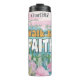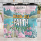 This image features an encouraging scripture quote against a serene natural backdrop. A tranquil body of water is flanked by lush greenery and trees under a soft, pastel sky. In the foreground, vibrant pink flowers and green foliage frame the text. The bold words "Walk By FAITH not by sight" convey a powerful message of trust and spiritual conviction over what is visible.