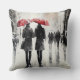 Great looking accent throw pillow, with a watercolor print of a rainy street, with a couple walking with red umbrellas.