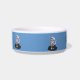 Walking cat on blue background, cat bowl. Add the name by replacing this text