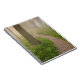 Notebook with a walking path through bluebells leading into a forest at sunrise on a foggy morning, creating a magical atmosphere.
