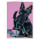 Subject illustration of a black Scottie anxiously holding out his leash. Ink and coloured pencils. (c) 2014 Andie.