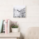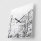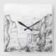 This is a white clock with a black and white sketch of a canyon with a river flowing through it. The river is wild with rocks lining the canyon walls inspired by my love of the southwest. The canyon walls rise straight up with the sky in the distance.