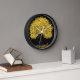 Beautiful wall clock with yellow leaves tree background and dark tree trunk, decorative.