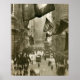 Old 1918 photo of celebration on Wall Street of Germany's surrender in WW1. New York City patriotic view with American flags, antique cars and crowds of people.