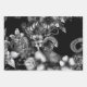 The image is a highly detailed black and white illustration featuring a combination of snakes and various flowers. The snakes are intricately patterned, with scales and textures that are meticulously drawn. The flowers are diverse, including large blooms and smaller blossoms, all rendered with fine lines and shading. The background is solid black, which makes the detailed elements of the snakes and flowers stand out prominently. This image is interesting due to its high level of detail and the contrast between the organic forms of the snakes and flowers against the stark black background. It is relevant for use in wrapping paper or wallpaper due to its intricate and visually appealing design, which can add a touch of elegance and sophistication to any surface it covers.