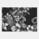 decorative wrapping paper, black and white illustration; intricate snake patterns; detailed flower designs; solid black background; high level of detail; organic forms; visually appealing design; elegant wallpaper; sophisticated wrapping paper.