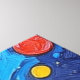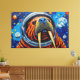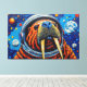 This artwork by Otis Porritt presents a striking portrait of a chimpanzee encased in a space helmet. Rendered with bold, impasto-like textures, the primate's face bursts with a kaleidoscope of vibrant hues, from deep blues and purples to fiery oranges and reds. The reflective visor frames its intense gaze, while the surrounding cosmos explodes with swirling nebulae and distant planets in a dynamic interplay of colour and light. The rich, layered application of colour creates a powerful, almost tactile visual experience, capturing a sense of wonder and exploration.