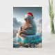 A walrus wearing a Santa Claus hat sits on a small ice floe surrounded by icy cliffs and frozen water