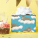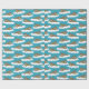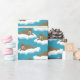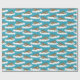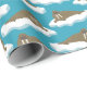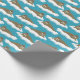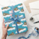 This illustrated wrapping paper has an all over pattern of walruses floating on ice bergs or sheets of ice. The realistic style walrus illustrations are set against a turquoise blue colored background.