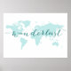 Wanderlust, strong desire to travel, text design, word art with teal world map poster, gift for him, gift for her, for globetrotter