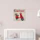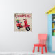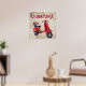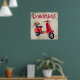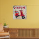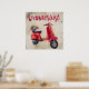 Cute poster with a whimsical painting of a red moped with a flower basket on the back. The moped has a trendy retro design. Ready for adventure. Wanderlust written in a fancy handwritten font. Inspirational typography. The background is a chic distressed looking texture with circles and random marks in a light brown colour.