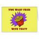 7 colour Retro style Advertising Cartoon. Red container of French fries against purple splash & red/black "You Want Fries With That?" text. Crisp. black white yellows oranges reds purple. Select your background colour.