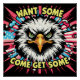 A fierce eagle with a bold, colourful comic-style backdrop is framed by the words "WANT SOME COME GET SOME." Dynamic shapes and vibrant colours create an energetic and intense visual impact.