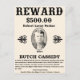 REWARD poster for Robert Leroy Parker, alias Butch Cassidy. Great looking replica historical poster would look great in a dorm room, or get the framed print and hang it in the rec room, billiard room or saloon! "reward poster" "reward" "wanted poster" "wanted" "wild west" "butch cassidy" "robert leroy parker" "dead or alive" "$500 reward" "outlaw" "gunslinger" "gunfighter" "OK Corral" "western" "cowboys" "Old west" "reward poster print" "framed print" "framed poster"