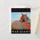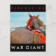 War Giant, a powerful and muscular chestnut thoroughbred. Photo was taken from behind the racehorse as he views the racetrack through his red and yellow blinkers.Horse is saddled and wearing the orange #7 saddlecloth on Pennsylvania Derby Day at Park Racing and Casino.