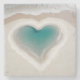 A heart-shaped pool of water with aqua hues is nestled within a sandy beach, surrounded by foamy waves. The ocean meets the shore in the background, creating a serene and romantic scene.
