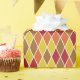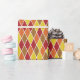 This fun geometric pattern, a traditional harlequin arrangement of diamond shapes, is colored in a warm autumnal theme with red, brown, orange, and yellow. The color scheme works well for birthdays, baby showers, or everyday gifts.