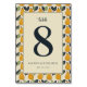 This wedding table card features a charming design with a playful pear pattern in shades of yellow, orange, and green on a cream background. The central rectangle highlights elegant cursive script for "table" above a bold numeral "8," surrounded by clean, modern typography. The whimsical pears add a touch of organic fun to the sophisticated layout, creating a warm and inviting atmosphere perfect for celebrating special moments. Ideal for weddings, this card combines stylish illustration with clear communication, making it both decorative and functional.