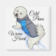 The design depicts a bichon in the snow with a warm jacket and heart.
